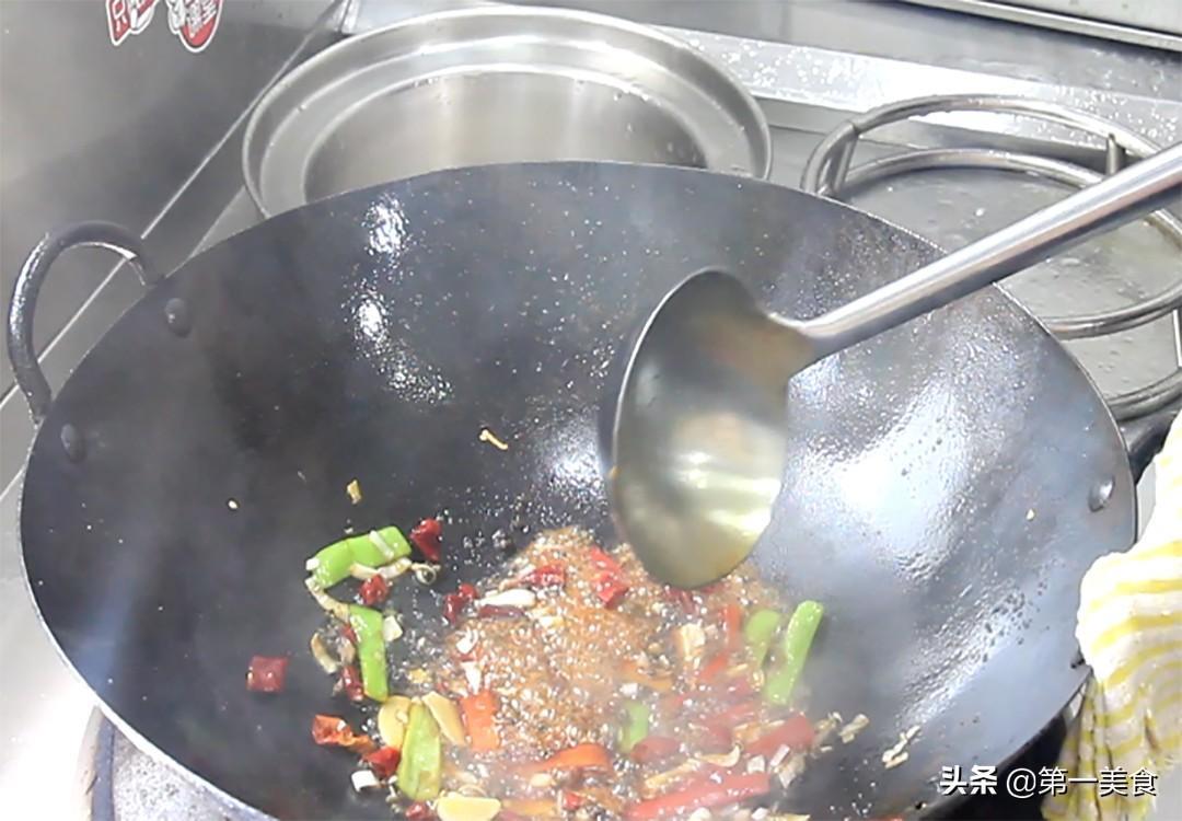 锅内留底油,倒入葱、姜、蒜、青红椒、花椒、干辣椒一起翻炒,翻炒出香味后,加入蒸鱼豉油20克,加入少量清水,放入白糖10克是为了综合一下蒸鱼豉油的咸味。