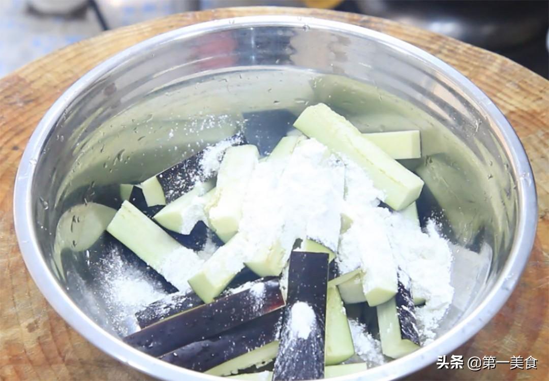 把茄子捞出控分水分,加入玉米淀粉20克,把茄子均匀地裹上玉米淀粉,加入玉米淀粉茄子炸出来口感更加酥脆,不易回潮。