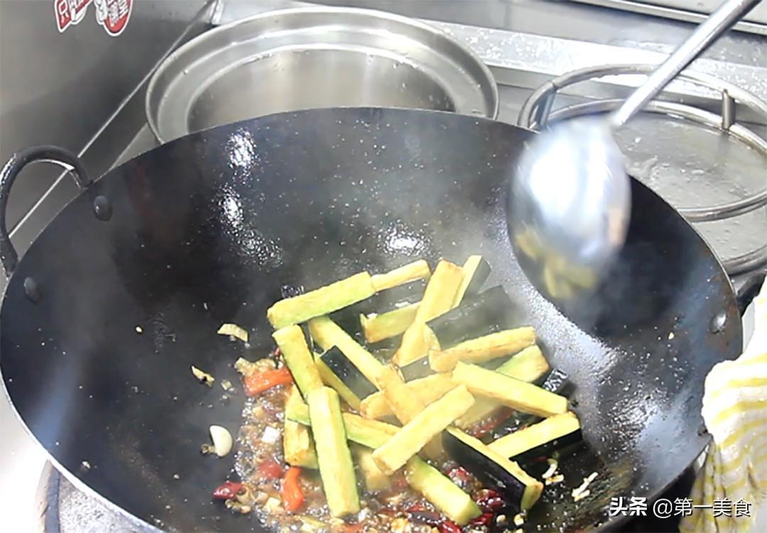 翻炒化开白糖以后,倒入炸好的茄子快速翻炒,汤汁均匀地裹在茄条上,即可出锅装盘。