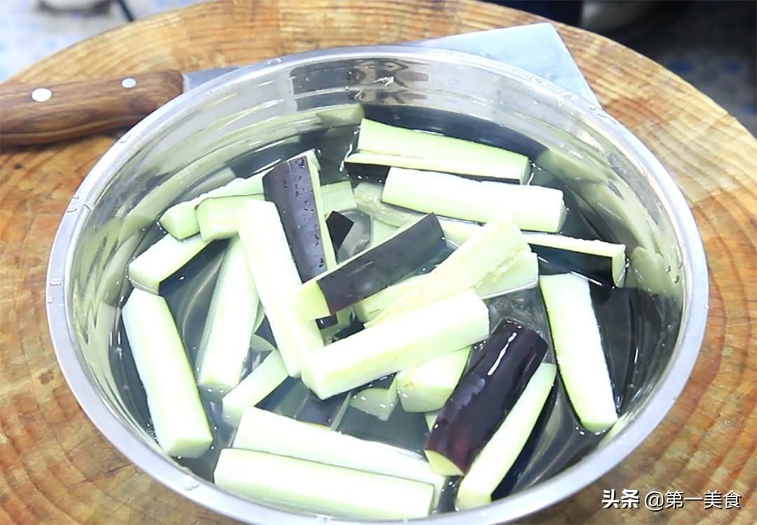 准备紫茄子一个,切成三段,再切成长条放入盆中,倒入适量的清水加入食盐2克,这一步的目的是为了防止茄子在空气中氧化变黑,在炸制时也不会吸油。