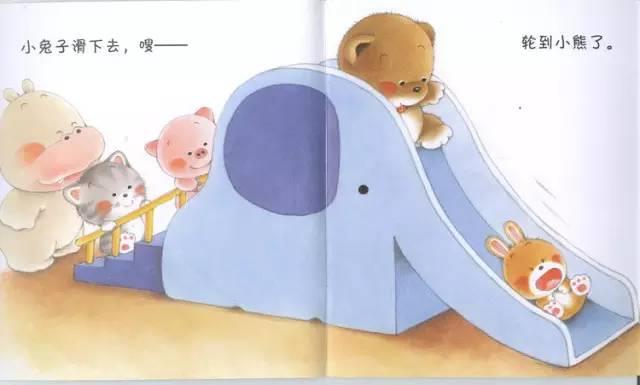 佐佐木洋子笔下的动物宝宝们特别生动可爱,无论是小熊、小兔或是小老鼠等都长的胖墩墩的,有大大圆圆的脑袋,肉肉的小手小脚,走起路来挺着肚子,撅着屁股,活灵活现就是我们身边那些可爱的小宝宝们。 更难得的是,佐佐木洋子充分把握了动物宝宝的神态,栩栩如生地把宝宝世界里的喜怒哀乐展现在我们面前: 游戏时的兴奋大笑,连眼睛都笑眯成一条缝;朋友见面时的友好微笑,有些害羞有些欣喜;更有逗人的困惑表情,最经典的要数《排好队》中,大家等着上厕所的表情,一个个动物宝宝们正很“辛苦”地忍着小便等候上厕所,滑稽极了。 这样的形象,宝宝们觉得很亲切,就像看到了好朋友一样,即使成人看了也情不自禁地被这些宝宝们的天真、逗趣所感染。 除了人物可爱之外,这套系列的画面非常干净,重点突出,没有太多无关画面干扰,很符合小年龄孩子的阅读习惯。