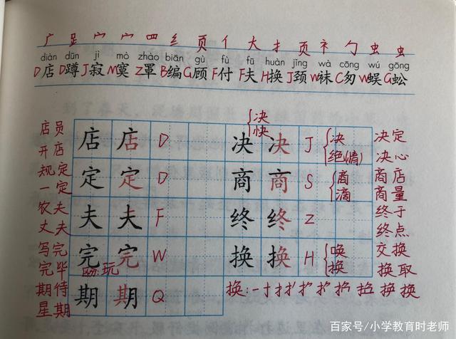 决左边是两点水,不是三点水,书写时左窄右宽;商是上下结构,注意商和滴右半部写法的区别;注意区分同音字决和绝,完和玩,能够区分组词;换的笔顺要注意!